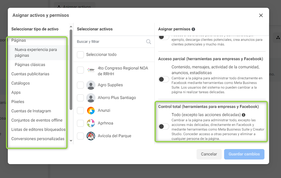 Seleccione todos los tipos de activos que desea compartir en la columna izquierda. En la columna central selecciona las cuentas específicas y luego asigna permisos totales: